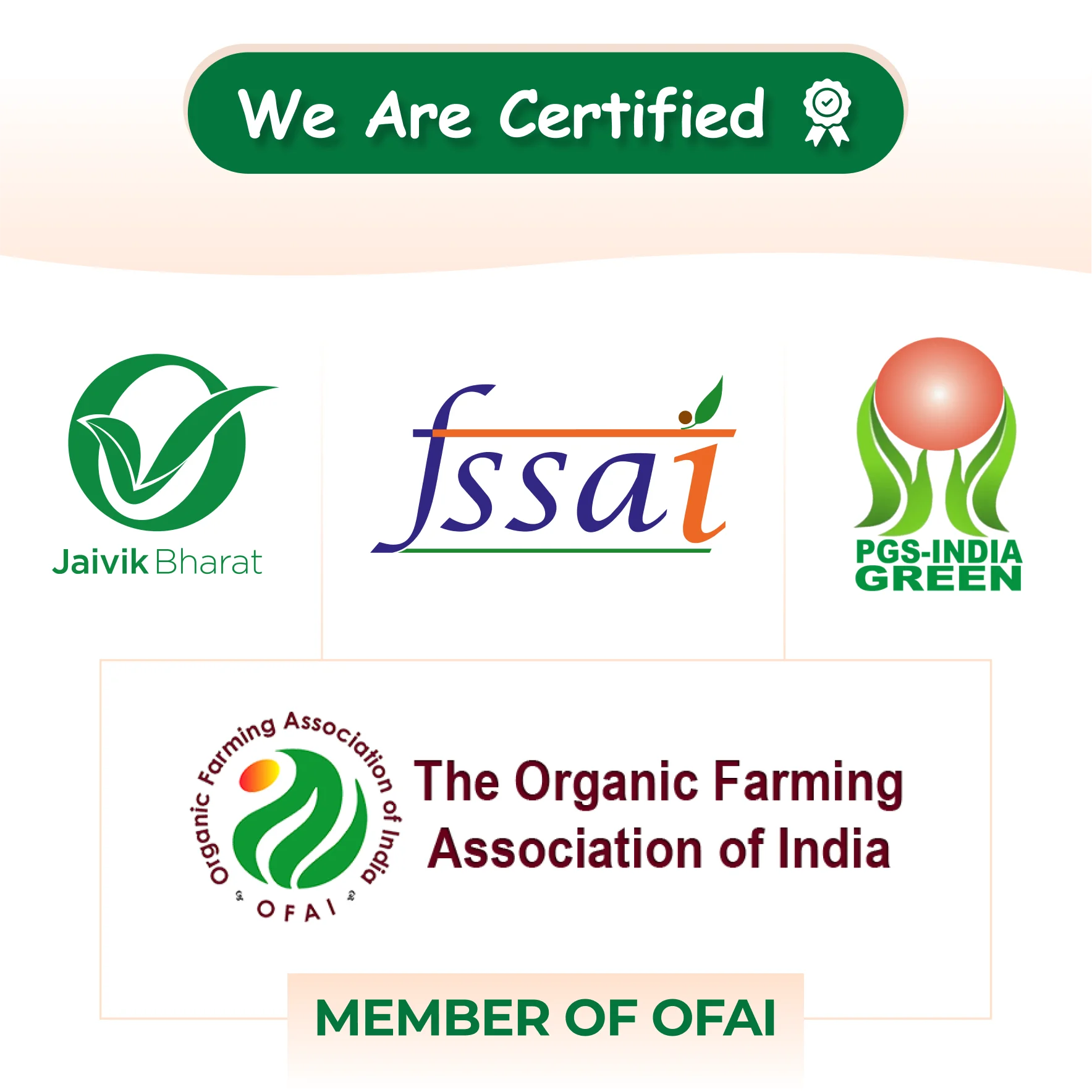 Our products are approved by PGS India, Jaivik Bharat, and FSSAI—ensuring safety and purity.
